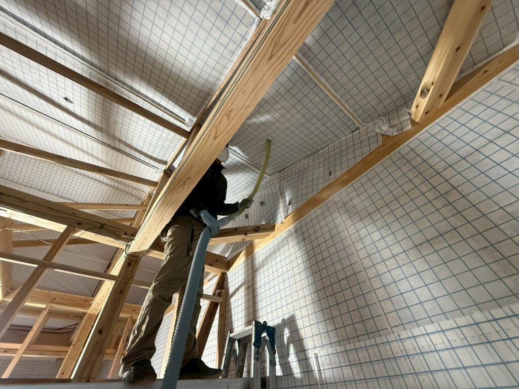 新聞紙をリサイクルしてできている、「デコスファイバー」を壁・天井に吹き込んでいただきました。