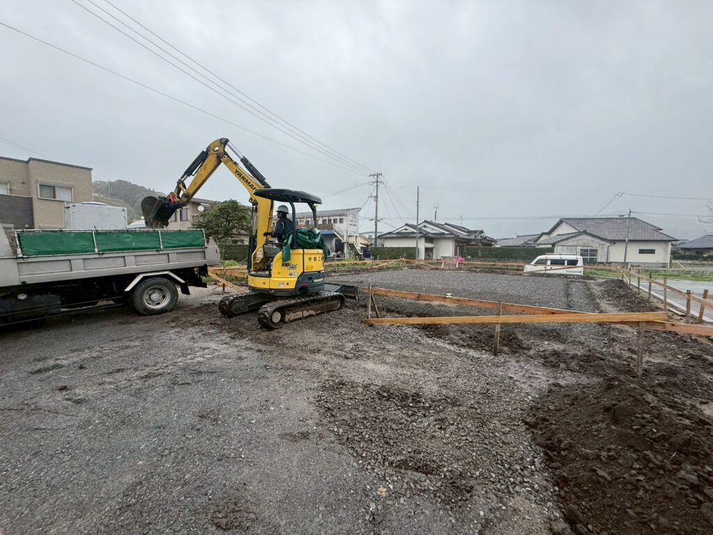 砕石を敷地全体に敷き、地面を転圧して地盤を固めます。
